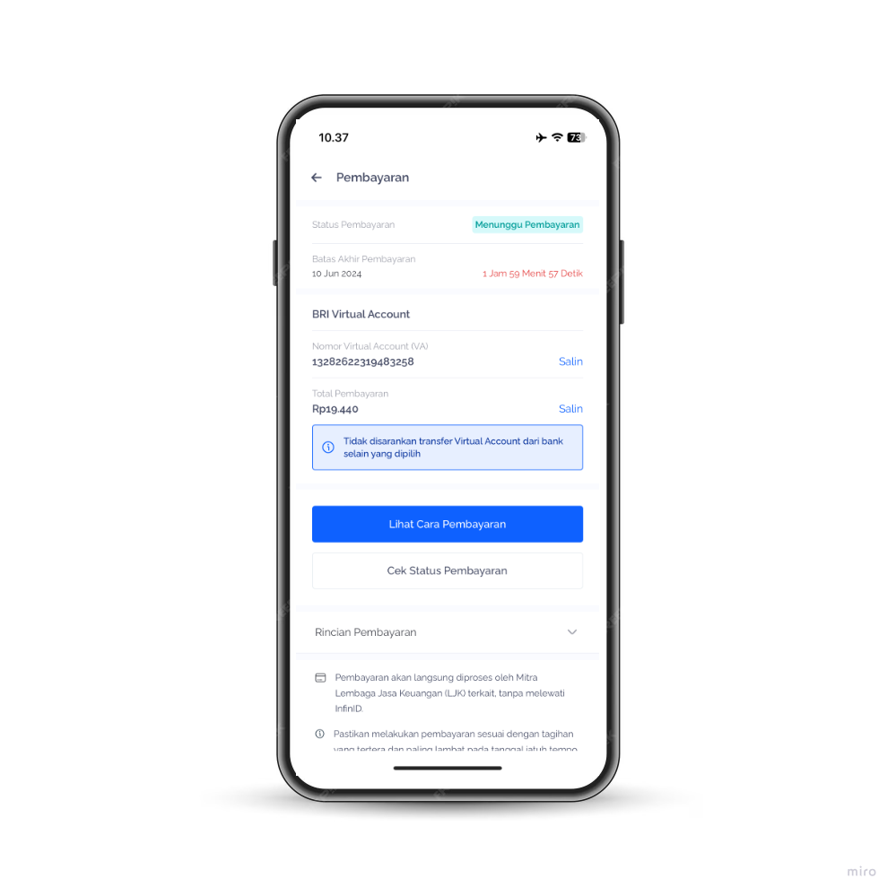 Buka aplikasi infinID di smartphone untuk lihat status dan riwayat pembayaran.